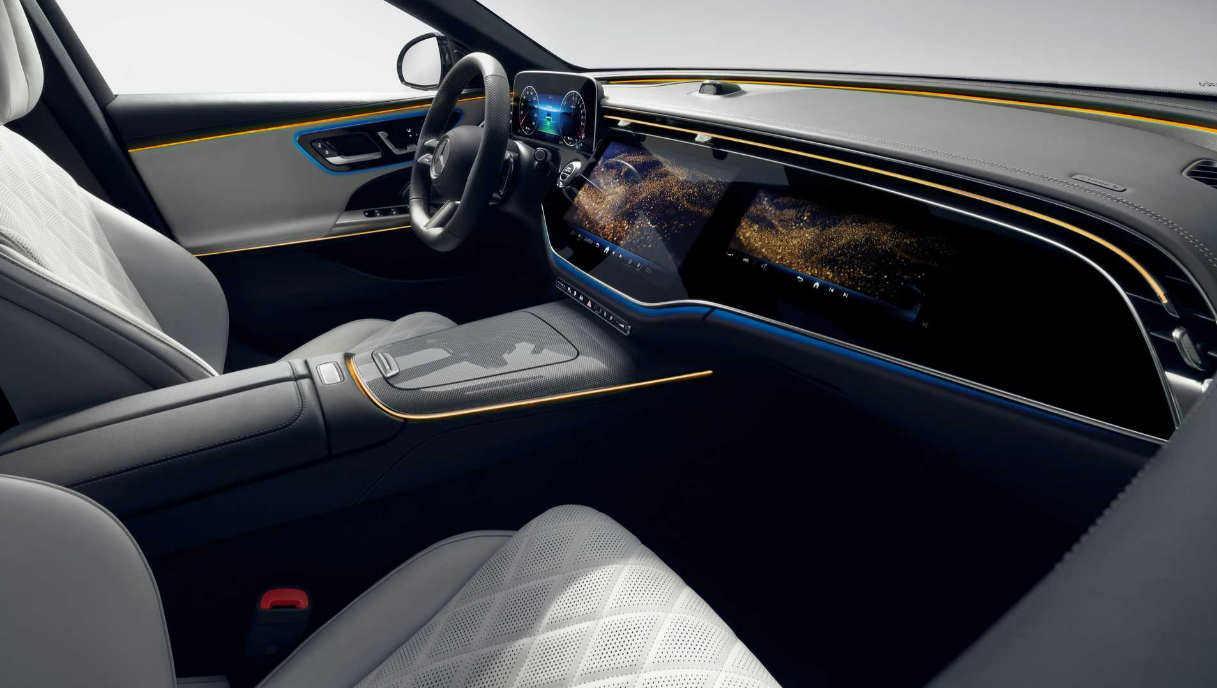 신형 E클래스(W214)의 실내 공간은 디지털 계기판과 중앙 디스플레이, 조수석 디스플레이로 구성된 ‘MBUX 슈퍼스크린’이라는 대형 디스플레이를 채택했다.