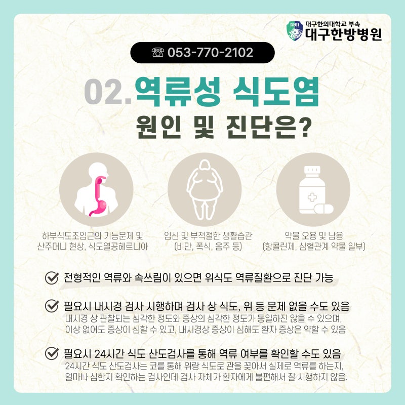 역류성 식도염은 생활습관을 개선하고 치료에 도움이 됩니다!병원 치료만큼이나 중요한 것은 생활습관을 조절하는 것이다. 수면 시 상체 부위를 높이고 타이트한 옷은 삼가야 하며 식사 직후 천장을 바라보고 눕지 말고 취침 직전 간식을 먹지 않는 것도 중요합니다!흡연자라면 담배를 끊고 비만인 경우 체중을 줄일 것을 권한다. 음주(알코올), 기름진 음식, 초콜릿, 주스, 콜라, 커피 등은 증상을 촉발하므로 가급적 피해야 한다. 또 껌을 씹으면서 침을 많이 분비하면 역류한 산의 중화에 도움이 되기 때문에 꼭! 기억해야 합니다!#역류성식도염증상 #역류성식도염원인