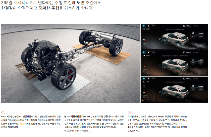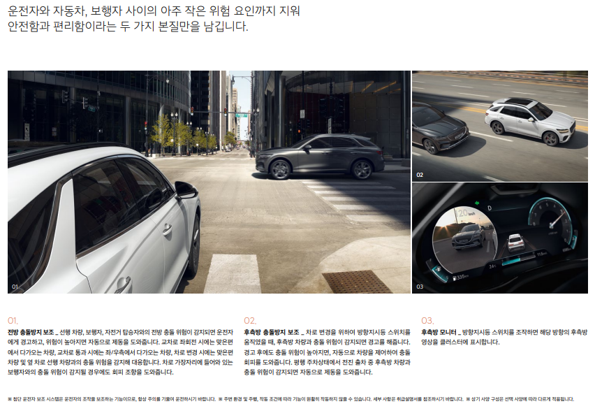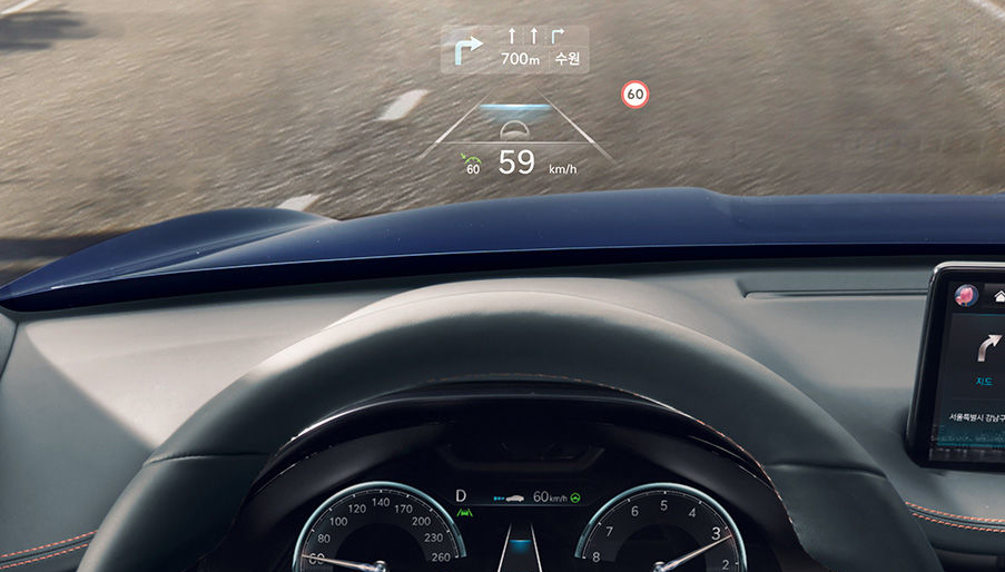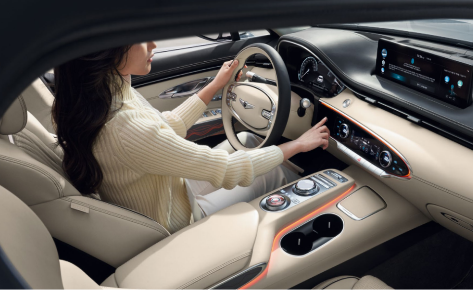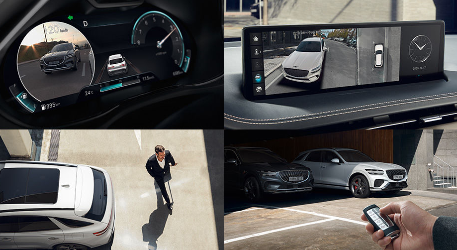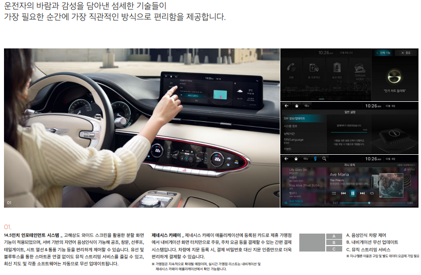 제네시스 인포테인먼트 시스템 (14.5인치 디스플레이, 제네시스 커넥티드 서비스, 도로 파손/슬립존 알림, 제네시스 카페이, 발레 모드, 음악 스트리밍 서비스)