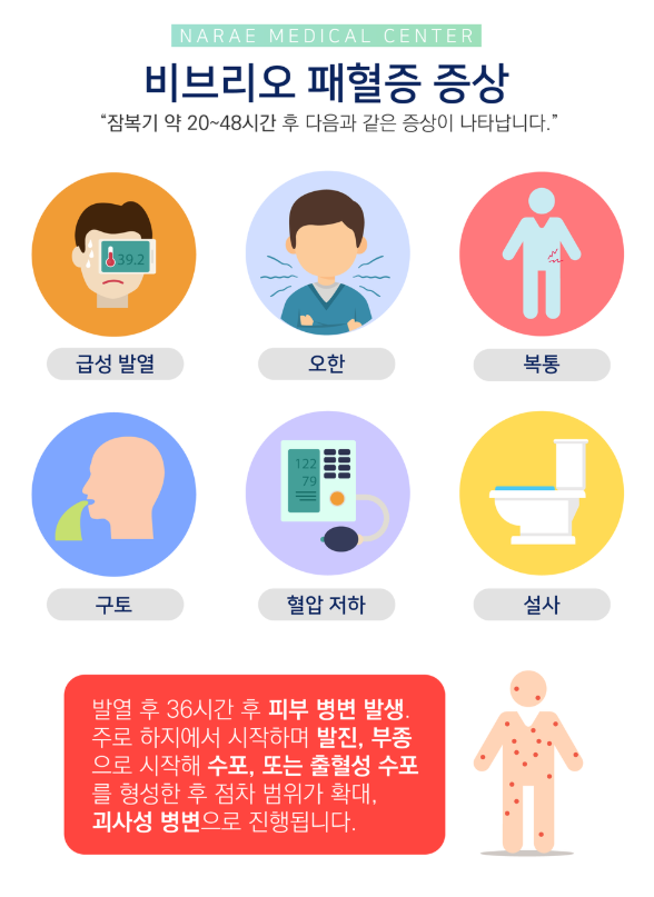 여름철에 주로 나타나는 비브리오 패혈증은 높아진 해수 온도에 따라 비브리오 브루니픽스균이 증식하면서 어패류에 침입해 어패류를 날로 먹거나 익혀 먹지 않아 걸리게 됩니다.간에 만성질환이 있거나 면역력이 떨어져 있으면 여름철 어패류는 85도 이상 충분히 읽어 먹으면 예방이 가능한 질병입니다.